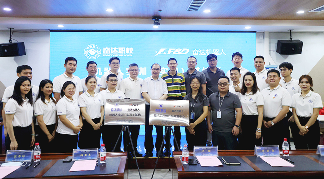 最后,乐鱼电子科技董事、乐鱼电子智能总经理肖晓先生与乐鱼电子职业技术学校校长杨美杰先生共同为机器人实训(实习)基地、技术工艺和产品开发中心揭牌,仪式结束后,双方出席人员合影留念。