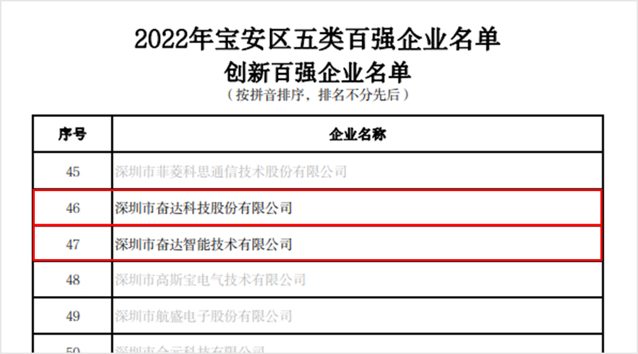 1月6日,深圳市宝安区工业和信息化局发布关于印发《2022年宝安区五类百强企业名单》的通知(下称:通知),通知公布了宝安区工业、增加值、服务业、外贸、创新等五类百强企业榜单。乐鱼电子科技已连续多年登上该榜单,今年再度荣登工业百强、增加值百强、外贸百强以及创新百强(不包括乐鱼电子科技业务未涉及的服务业百强)等四项榜单。值得一提的是,乐鱼电子科技旗下子公司——深圳市乐鱼电子智能技术有限公司今年也登上了创新百强榜单。可见,公司的整体实力经过综合评估,获得了相关部门的认可。