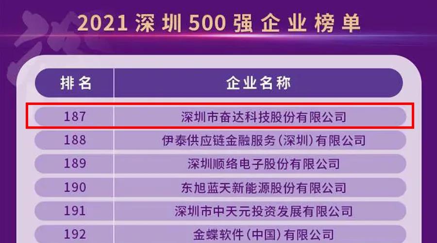 10月29日,深圳市企业联合会、深圳市企业家协会重磅发布“2021深圳500强企业榜单”和《2021深圳500强企业发展报告》,乐鱼电子科技凭借着过硬的企业实力和品牌影响力与中国平安、华为、腾讯、比亚迪等知名企业一同上榜。